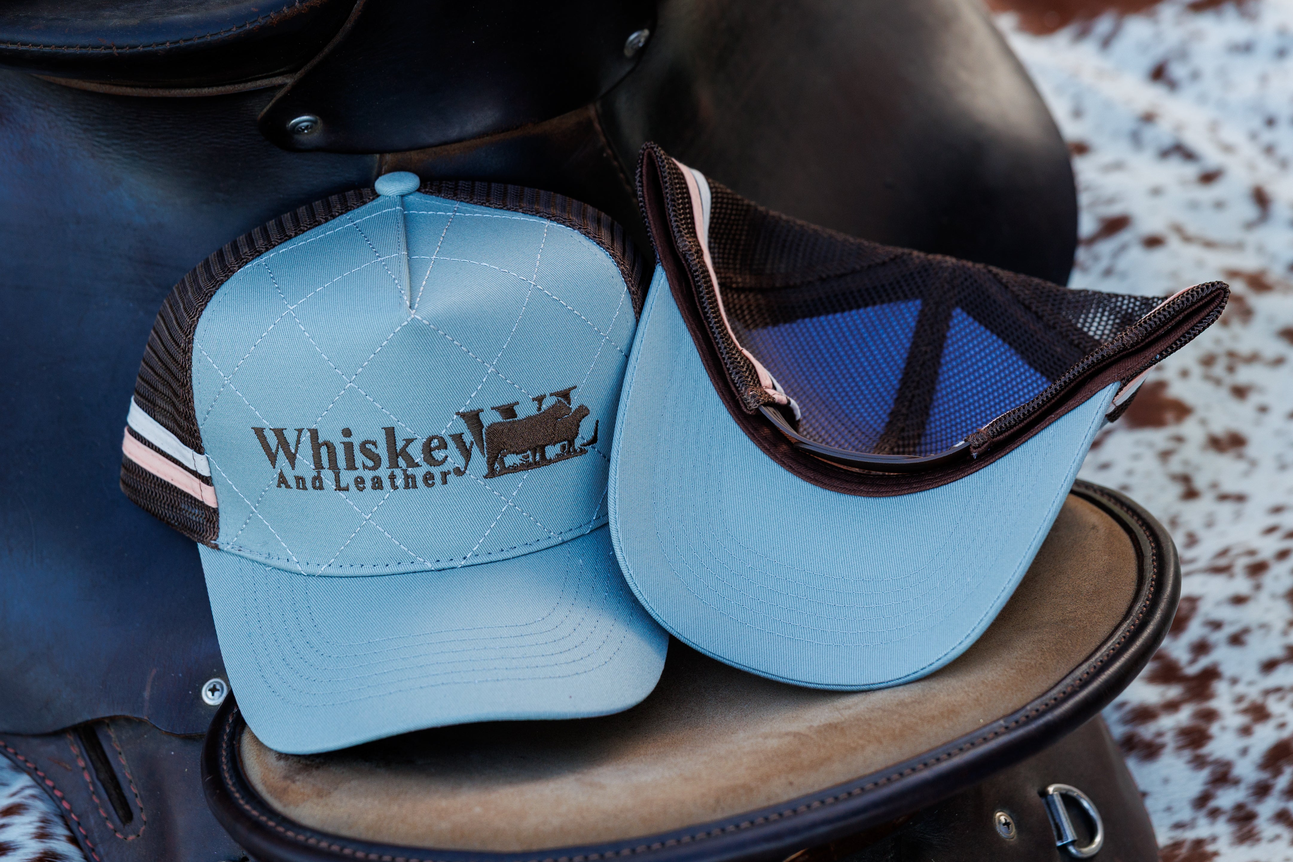 The super popular ladies pony tail light blue trucker cap with stunning white and floral details